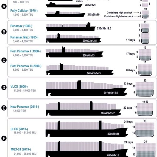 تکامل از کشتیهای ۵۰۰ TEU در دهه ۱۹۵۰ به غولهای امروزی ۲۵٬۰۰۰ TEU کلاس MGX-24، یکی از مهمترین تغییرات ساختاری در صنعت کشتیرانی بوده است.